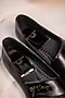 Featuring a pair of black handmade braided loafers in leather base with patina hand finish. It has a teal blue leather sole and a cushion footbed.