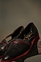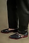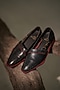 Featuring a pair of black and white caligae shoes in leather base with jmc buckles.
