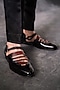 Featuring a pair of black and wine guitar caligae in leather base with patina hand finish, metal buckle, and a chain closing strap. It has a teal blue leather sole and a cushion footbed.