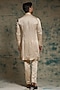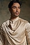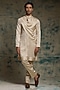 Featuring a butter cream draped kurta in linen silk base. It is paired with tapered trousers. Style it with pants and sandals for a festive occasion or wedding ceremony.