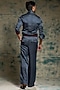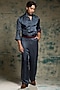 Featuring a charcoal blue shirt in linen silk base with high collar, potli buttons and pintuck detailing. It is paired with gathered waistband straight trousers. Style it with pants and sandals for a festive occasion or intimate pooja ceremony.