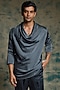 Featuring a charcoal blue cowl kurta in linen silk and satin lycra base. It is paired with straight trousers. Style it with pants and sandals for a festive occasion or wedding ceremony.