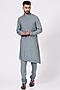 Featuring a chateau grey asymmetrical kurta in slub silk base. It is paired with matching churidar pants.