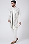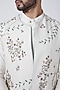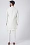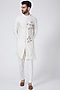 Featuring an ivory shrug in slub silk base with hand painting and hand texture. It is paired with a matching asymmetric front open kurta and trousers.