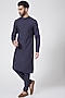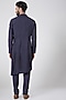 Featuring a midnight blue asymmetric kurta in slub silk base with shoulder buttons and pintuck. It is paired with matching churidar pants.