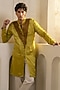 Featuring a gold moss kurta in linen silk base with zari and moti embellishments. It is paired with ivory tapered trousers. Style it with a pair of mojaris for a festive occasion, cultural event, wedding or engagement ceremony.