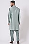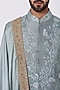 Featuring an ice blue ombre sherwani in linen silk base with resham embroidery. It is paired with a kurta and churidar. Perfect for a wedding, engagement or sangeet ceremony, exuding charm and elegance.