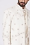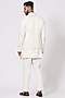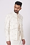 Featuring an ivory short jacket in slub silk base with hand embroidery. It is paired with a matching short kurta and trousers.