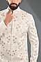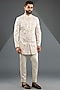 Featuring an ivory indowestern jacket in linen silk, crepe and slub silk base. It is paired with pants. Perfect for a wedding, engagement or sangeet ceremony, exuding charm and elegance.