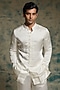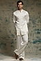 Featuring an ivory kurta in linen silk base with high collar, silver buttons and pintuck detailing. It is paired with straight trousers. Style it with pants and sandals for a festive occasion, intimate pooja or sangeet ceremony.
