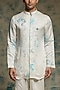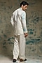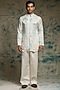 Featuring an ivory short kurta in linen silk base with marble dyed and band collar. It is paired with straight trousers. Style it with pants and sandals for a festive occasion, an intimate pooja or sangeet ceremony.