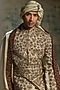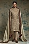 Featuring a beige sherwani in linen silk base with zari, sequins and stone hand embroidery. It is paired with an anarkali kurta and churidar. Perfect for a wedding, sangeet or engagement ceremony, exuding charm and elegance.