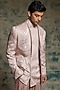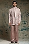 Featuring a mauve blazer in linen silk base with dori and sequins hand embroidery. It is paired with an asymmetric shirt and pleated trousers. Style it with kolhapuri sandals for a wedding, sangeet or engagement wear.