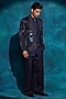Featuring a midnight blue blazer in linen silk base with hand embroidery. It is paired with a zipper shirt and trousers. Perfect for festive occasions or wedding ceremonies, exuding charm and elegance.