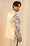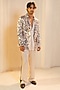 Featuring a pearl ash blazer in linen silk base with embroidery. It is paired with a kurta and trousers. Style it with a pair of shoes for a cocktail, reception, sangeet or engagement ceremony.