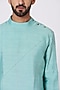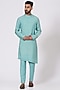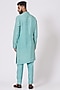 Featuring a pool blue asymmetrical kurta in slub silk base with shoulder buttons. It is paired with matching trousers.