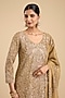 Featuring a beige straight kurta in shimmer tissue base with tikki and jaal work. It is paired with pants and a dupatta. Accentuate it with kundan polki jewellery, soft curls and block heels for festive occasions or daytime weddings.
