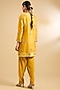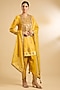 Featuring a mustard tunic in silk organza and crepe base with mirror work. It is paired with tulip pants and a dupatta. Accentuate it with statement jewellery and heels for a festive occasion or pooja ceremony.