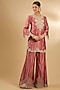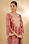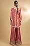 Featuring an orange tunic in handloom silk base with moti and threadwork. It is paired with semi-flared pants. Accentuate it with statement jewellery and heels for a festive look.