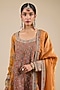 Featuring an orange kurta in shimmer tissue base, adorned with thread embroidery. It is paired with pants and a dupatta. Accentuate it with polki dangler earrings and wedges for festive occasion or sangeet ceremony.