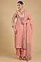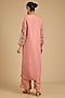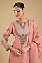 Featuring a pink kurta in shimmer tissue base with an antique work. It is paired with pants and a dupatta. Style this kurta set with polki stud earrings, soft curls and metallic heels for festive occasions, weddings or sangeet ceremonies.