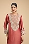Featuring a rust tunic in handloom tissue base with thread and moti embroidery. It is paired with pants. Accentuate it with kundan polki jewellery and block heels for festive occasions or daytime celebrations.