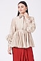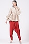 Featuring a beige peplum top in silk base with embroidered collar. It is paired with contrasting red dhoti pants.