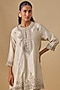 Featuring a beige tunic in silk base with zardosi embroidery. It is paired with dhoti pants. Accentuate it with statement jewellery and heels for a festive occasion or pooja ceremony.