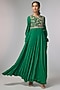 Featuring a bottle green anarkali in chiffon and raw silk base with zardosi work. It is paired with a churidar. Style with polki jewellery, soft curls and heels for festive occasions, weddings or mehendi ceremonies.