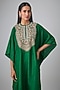 Featuring a bottle green kaftan in silk base with thread work. It is paired with palazzo. Accentuate it with polki earrings and block heels for festive celebrations, pooja or mehendi ceremony.