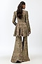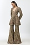 Featuring a golden beige peplum in georgette base with sequins and zardosi embroidery. It is paired with embroidered sharara pants. Accentuate it with statement earrings and heels for festive occasions, sangeet or wedding ceremonies.