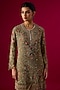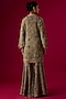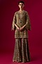 Featuring a golden beige tunic in georgette base with sequins embellishments. It is paired with sharara pants. Style with polki jewelry, soft curls and embellished heels for weddings, engagements or festive events.