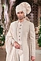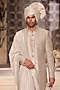 Featuring a beige sherwani in raw silk base with dori hand embroidery. It is paired with a kurta, pants, safa and a dupatta. Style it with mojaris and a malas and a wedding or engagement ceremony.