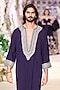 Featuring a purple kaftan in georgette base with zardosi hand embroidery. It is paired with pants. Style it with mojaris for a festive occasion, family gathering, wedding or engagement ceremony.
