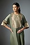 Featuring a mint green kaftan in silk base with banarasi border. It is paired with palazzo pants. Accentuate it with polki stud earrings and block heels for family gatherings or festive ceremonies.