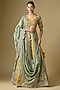 Jayanti Reddy features a stunning mint and mustard lehenga set, which is crafted in raw silk fabric with embroidery. It is paired with an embroidered blouse and a dupatta. Accessorise the designer set with polki jewellery and heels for an engagement or wedding ceremony.