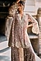Jayanti Reddy showcases a peach kurta in net base with sequin embroidery. It is paired with sharara and a dupatta. Style this designer essemble with meenakari earrings, a potli bag and metallic heels for a festive celebration, pooja or sangeet ceremony.