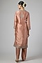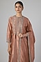 Featuring a peach kurta in silk base with zardosi work. It is paired with palazzo pants and an embroidered dupatta. Accentuate it with dangler earrings and heels for a festive occasion, wedding, engagement or intimate pooja ceremony.
