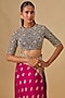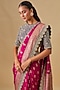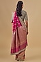 Featuring a pink saree in banarasi silk base with zardosi embroidery. It is paired with an embroidered blouse. Accentuate it with dangler earrings and heels for a festive occasions or wedding ceremonies.