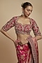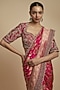 Featuring a pink saree in banarasi silk base with zari embroidered border. It is paired with an embroidered blouse. Accentuate it with statement jewellery and heels for weddings or festive occasions.