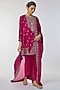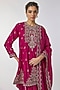 Featuring a rani pink tunic in silk base with zardosi work. It is paired with a dhoti and an embroidered dupatta. Accentuate with statement jewellery and heels for a wedding or sangeet ceremony.