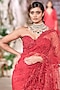 Featuring a red saree in net base with thread and beads hand embroidery. It is paired with an embroidered bustier. Accentuate the designer saree with swarovski or zircon jewellery, embellished heels and a clutch for a bridal look, Perfect wear for a sangeet or cocktail ceremony.