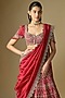 Jayanti Reddy features a stunning red lehenga set, which is crafted in raw silk fabric with embroidery. It is paired with an embroidered blouse and a dupatta. Accessorise the designer set with polki jewellery and heels for an engagement or wedding ceremony.