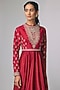 Featuring a red anarkali in raw silk and silk base with zardosi work. Accentuate it with kundan polki earrings, a clutch and metallic heels for a stylish ensemble, ideal for festive occasions, cultural celebrations or sangeet ceremonies.