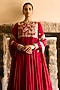 Jayanti Reddy showcases a red anarkali in raw silk and chiffon base with zardosi embroidery. It is paired with churidar. Style this designer essemble with meenakari earrings, a potli bag and metallic heels for a festive celebration, pooja or sangeet ceremony.