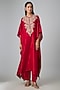 Featuring a red kaftan in silk base with thread work. It is paired with palazzo. Accentuate it with polki earrings and block heels for festive celebrations or pooja ceremony.
