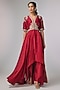 Featuring a red high-low anarkali in silk base with zardosi work. It is paired with palazzo. Style with polki jewellery, soft curls and embellished heels for festive soirees or pooja ceremony.