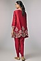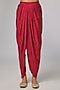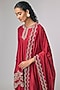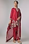 Featuring a red kurta in silk base with zardosi work. It is paired with a dhoti and an embroidered dupatta. Style this with kundan polki jewellery and heels for a festive occasion, poojas or family gatherings.