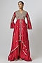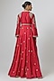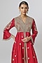 Featuring a red anarkali in silk base with zari embroidery and fan sleeves. It is paired with palazzo pants. Accentuate it with statement jewellery and heels for festive occasions or wedding ceremonies.