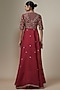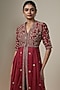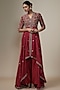 Featuring a red high-low anarkali in silk base with zari embroidery. It is paired with palazzo pants. Accentuate it with minimal jewellery and heels for festive occasions or wedding ceremonies.